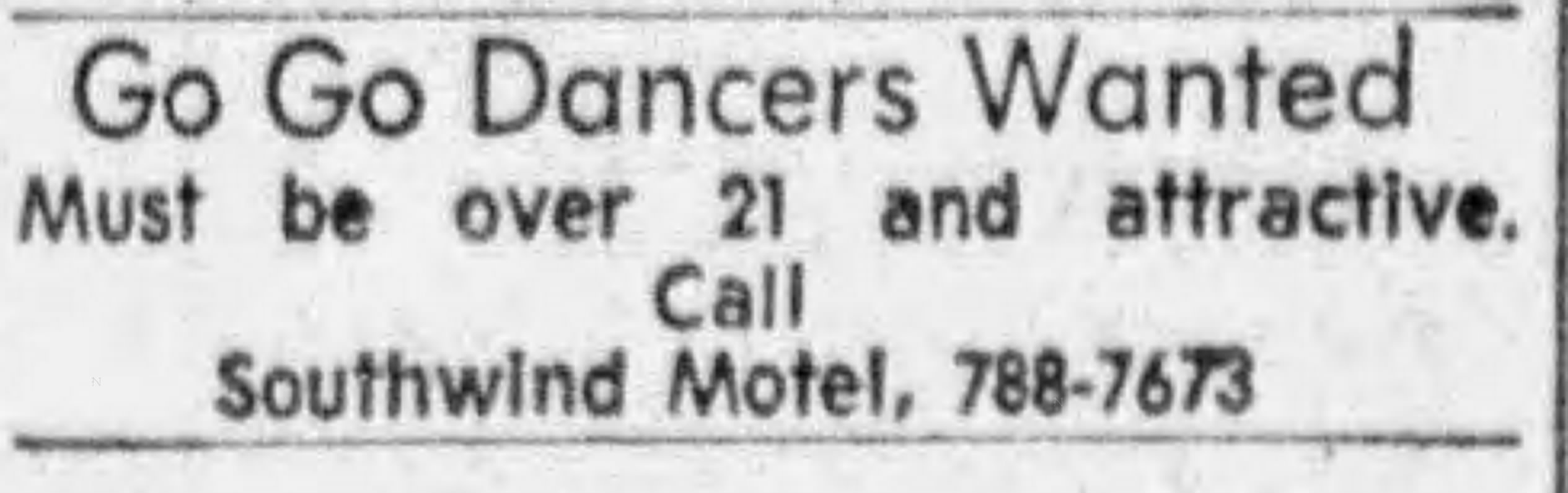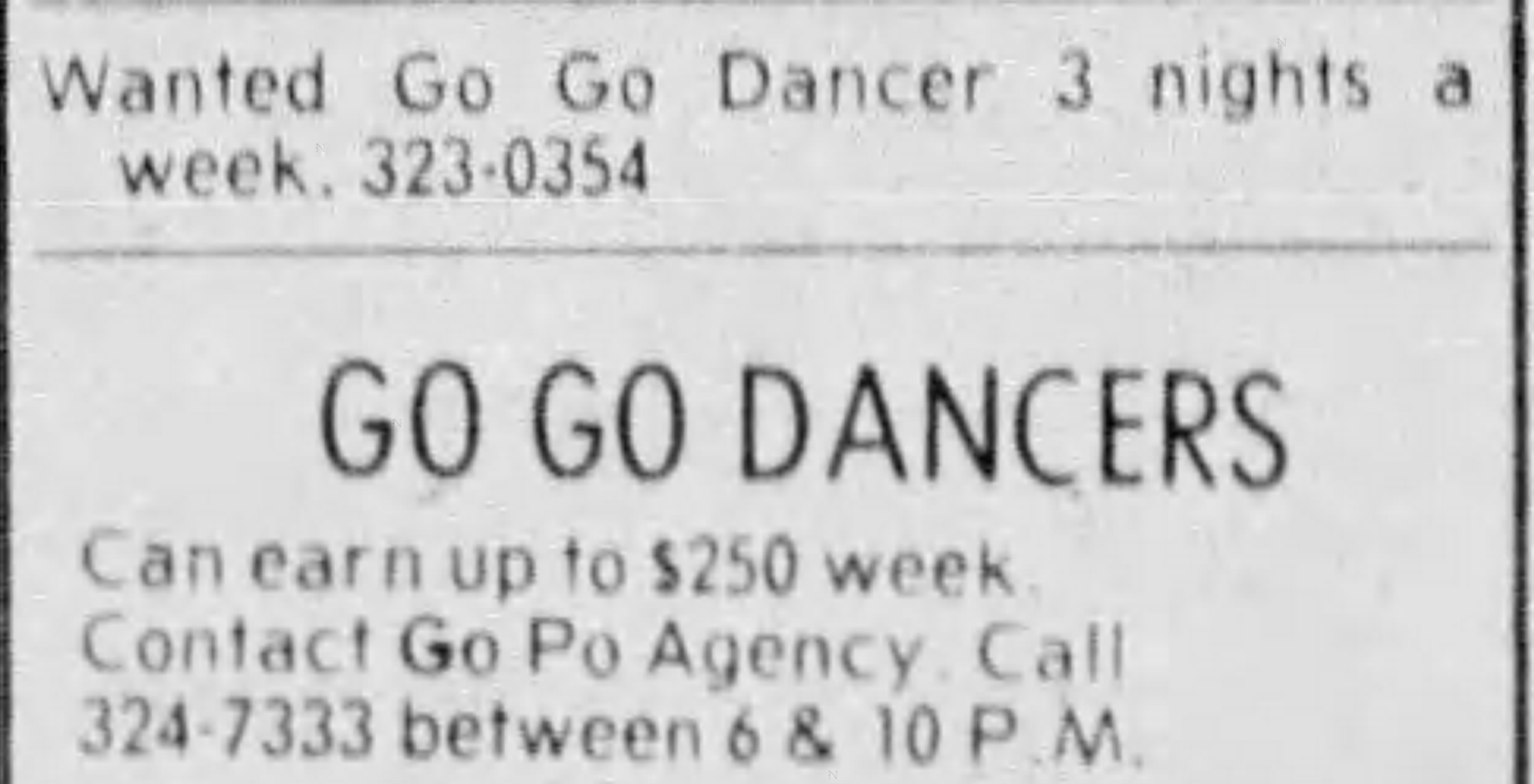One 1970 listing from the Go Po Agency advertised openings for go-go dancers earning up to $250 a week—equivalent to more than $2,000 today.