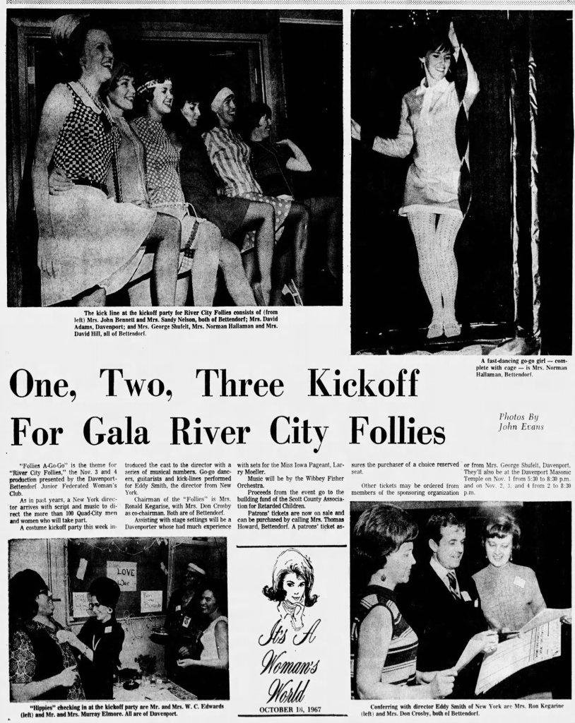 The Davenport-Bettendorf Junior Federated Woman’s Club launched a musical production, Follies A-Go-Go, with a lively costume kickoff party in October 1967. Directed by Eddy Smith of New York, the show features over 100 local performers from the Quad Cities. The kickoff included go-go dancers (complete with cage), guitarists, and kick-lines, blending 1960s pop culture with community theater flair. The production, scheduled for November 3 and 4, benefitted the Scott County Association for Retarded Children’s building fund. Tickets were available through club members and at the Davenport Masonic Temple.