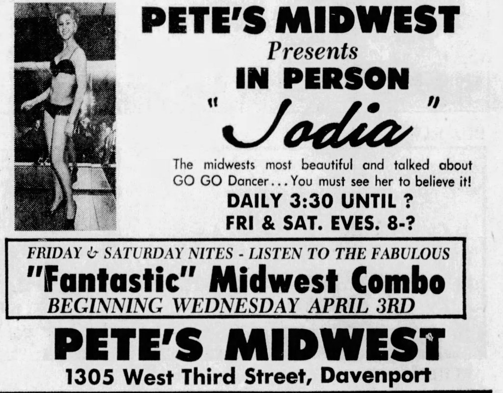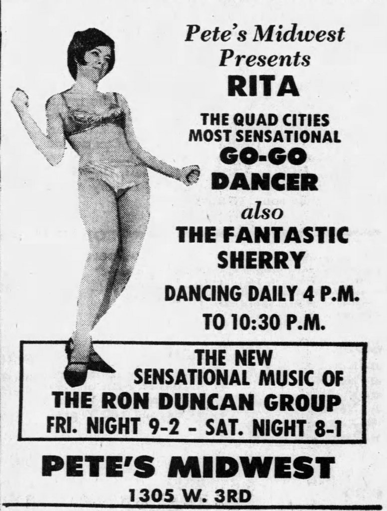 Pete’s Midwest was one of the key Davenport clubs responsible for bringing a steady stream of go-go dancers into the Quad Cities nightlife circuit. Throughout the late 1960s and early 1970s, the venue became known for its high-energy atmosphere and its ability to attract dancers from across the Midwest, many of whom traveled specifically for the reliable work and lively crowds. Pete’s Midwest helped cement Davenport’s reputation as a regional hub for go-go entertainment, offering a stage where dancers could hone their craft and where audiences could experience the era’s shifting nightlife trends up close.