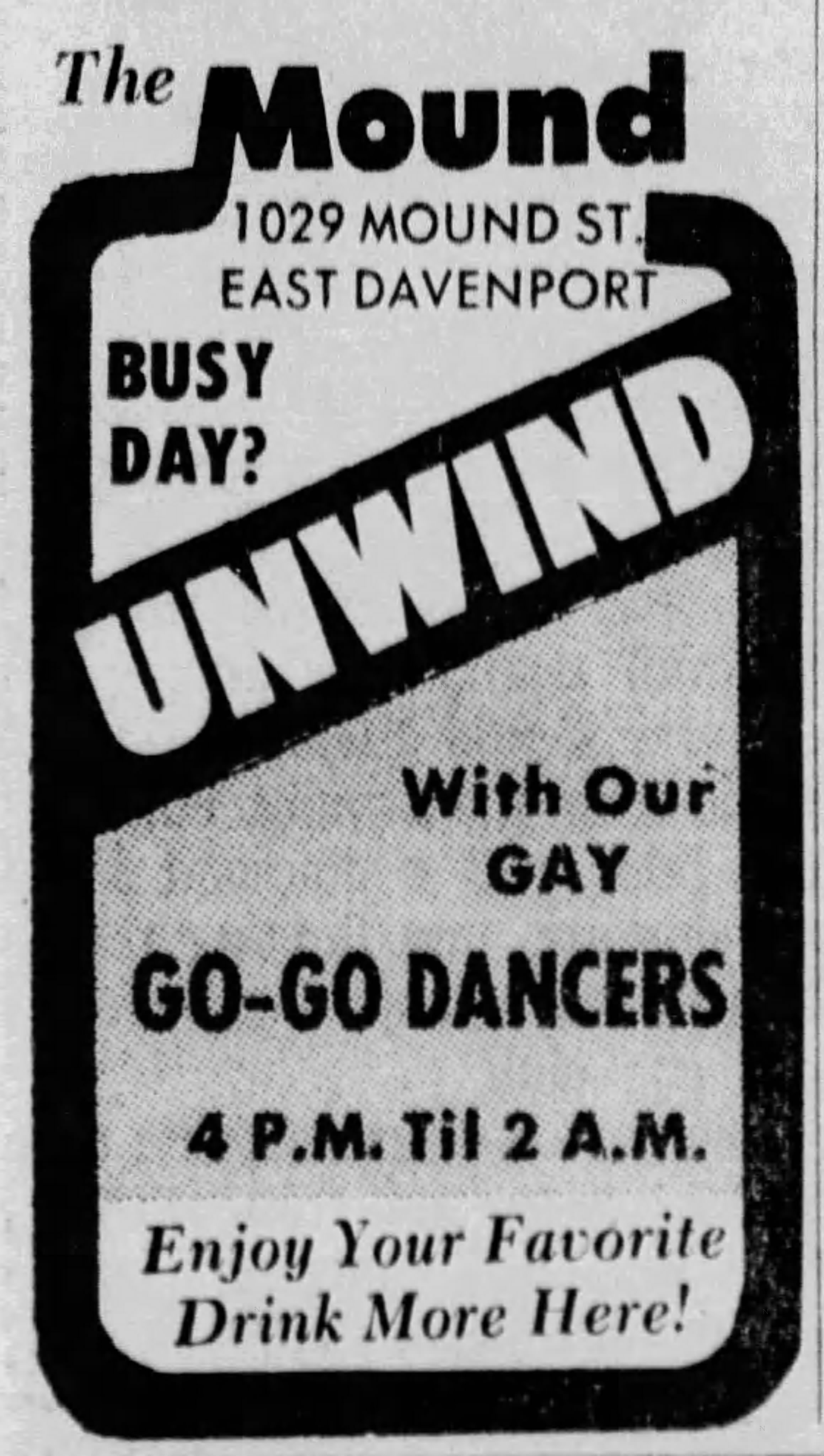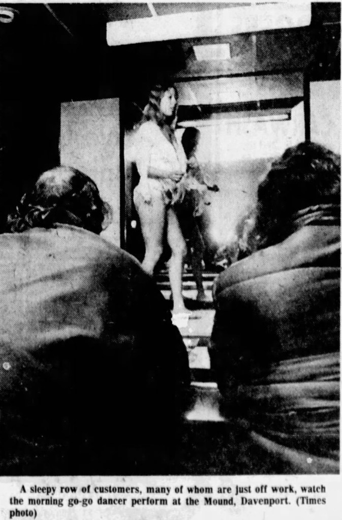 The Mound, managed by Ken Sederstrom, was one of the Quad Cities clubs that leaned into the demand for live entertainment by featuring semi‑nude go‑go dancers on Friday and Saturday mornings.