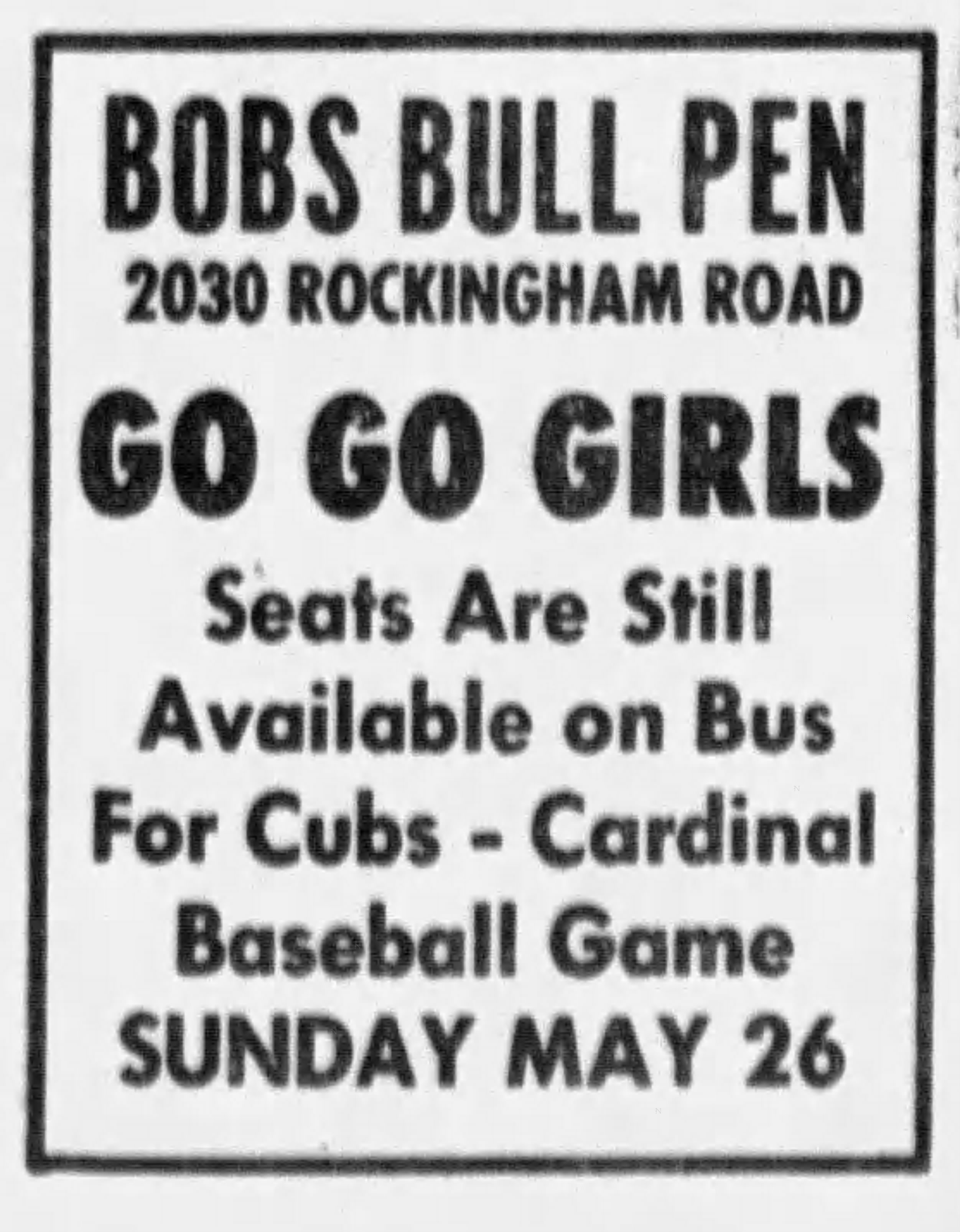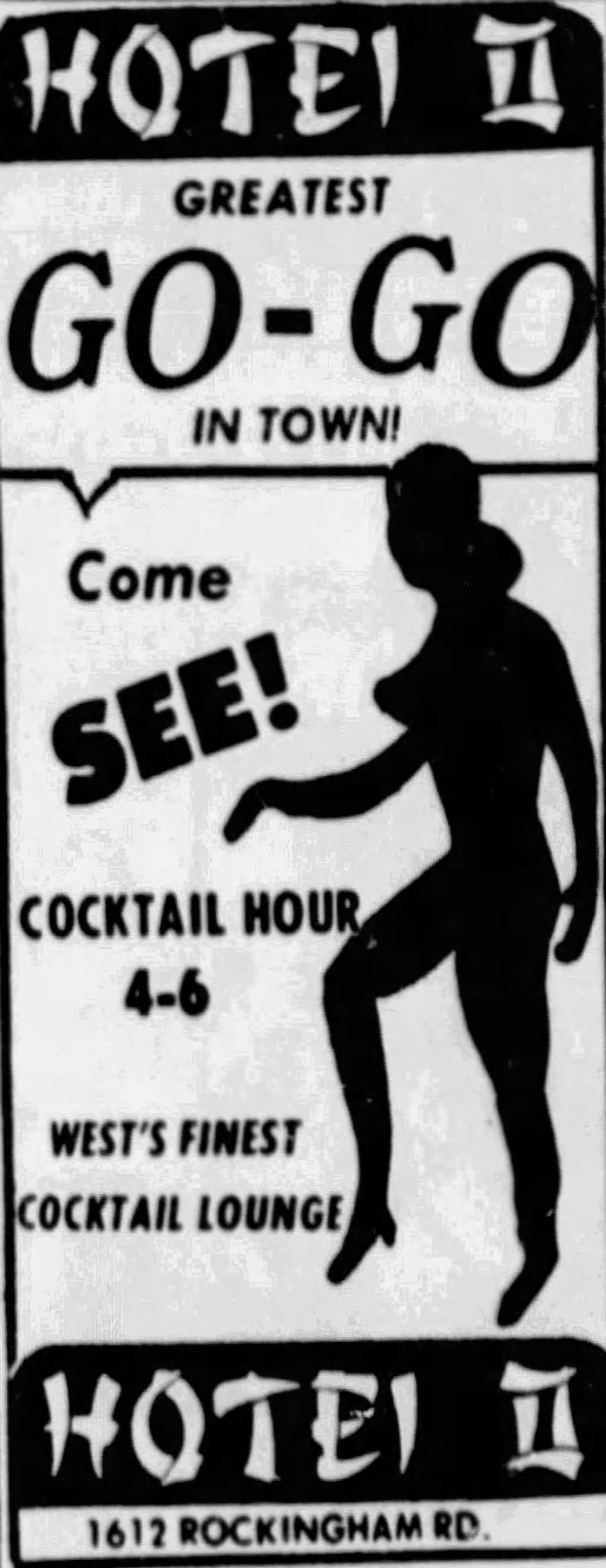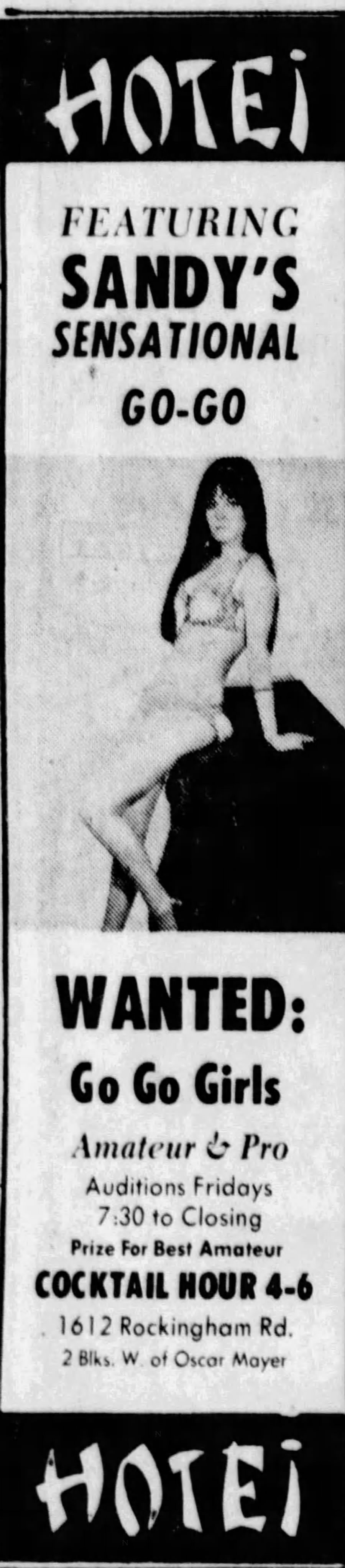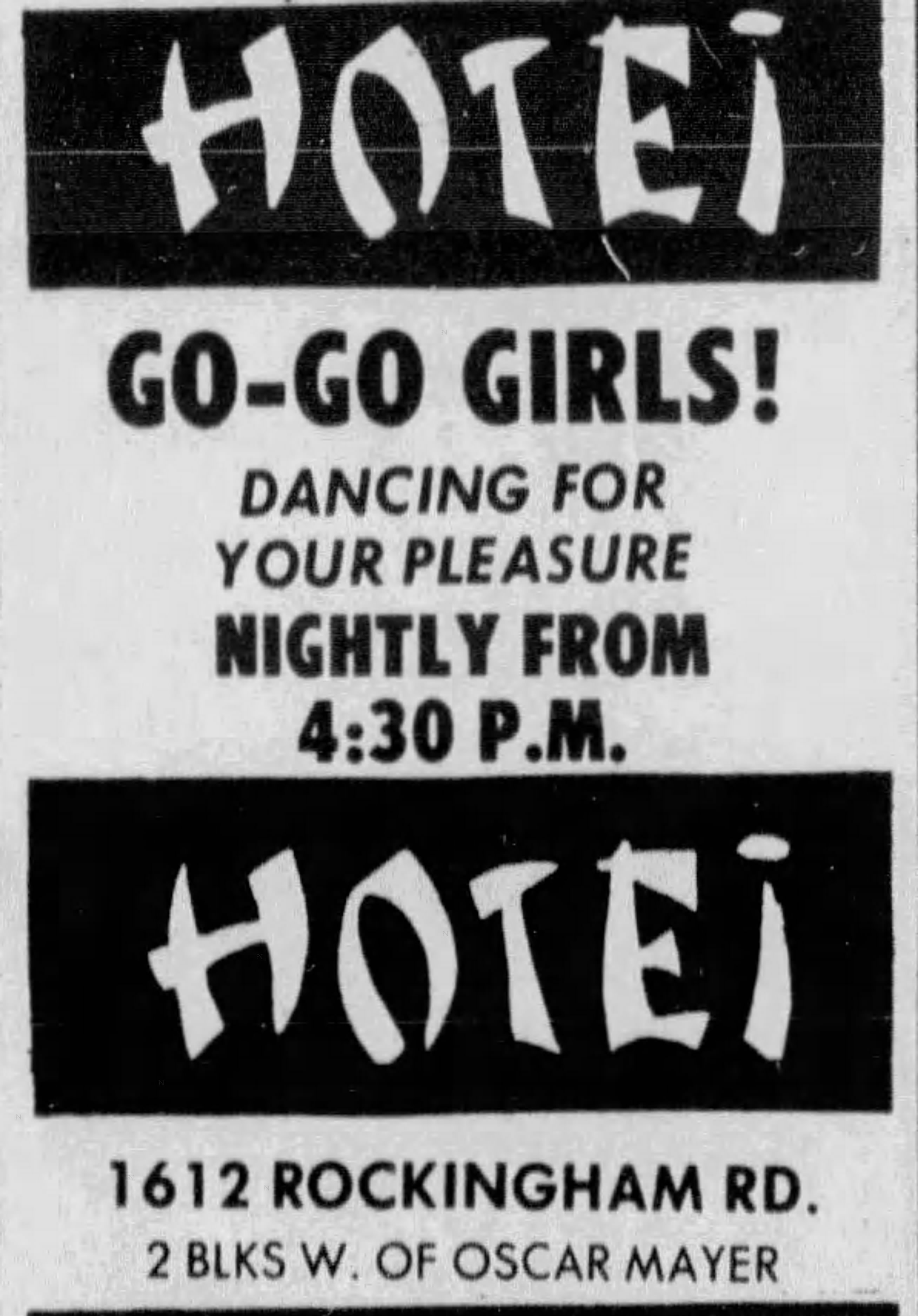 Like many clubs along Rockingham Road in the late 1960s and early 1970s, the Hotei bars catered to working‑class patrons and travelers passing through, offering an accessible, high‑energy alternative to the more polished downtown lounges. While documentation on the venues is sparse, their persistent advertising suggests they were reliable fixtures in Davenport’s erotic entertainment landscape, contributing to the corridor’s reputation as a hub for go‑go dancing and adult nightlife.