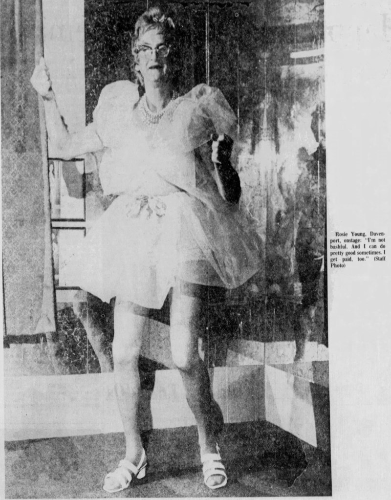 “I only dance on stage on Thursdays. But I’m here almost every night. I dance with the young ones and the old ones and the middle-aged ones. And I like to talk to interesting people. It was all I could do to stay home last night. I wanted to get in a cab and come out here. Jim (the owner) knew I liked to dance, so he suggested I dance on stage one night a week. I’m not bashful. And I can do pretty good sometimes. I get paid too…They come from Geneseo, all around to see me. I’ve danced in Walcott and Lone Tree. The other night a guy from Maquoketa was in here and he wants me to dance at his club. Last summer I danced on a float in the Durant Centennial…About a year ago I won $100 in an amateur go-go contest in Coralville. I tore the place apart,” Rosie chuckled. (Quad City Times. “A Go-Go Great Grandmother.” July 28, 1972)
