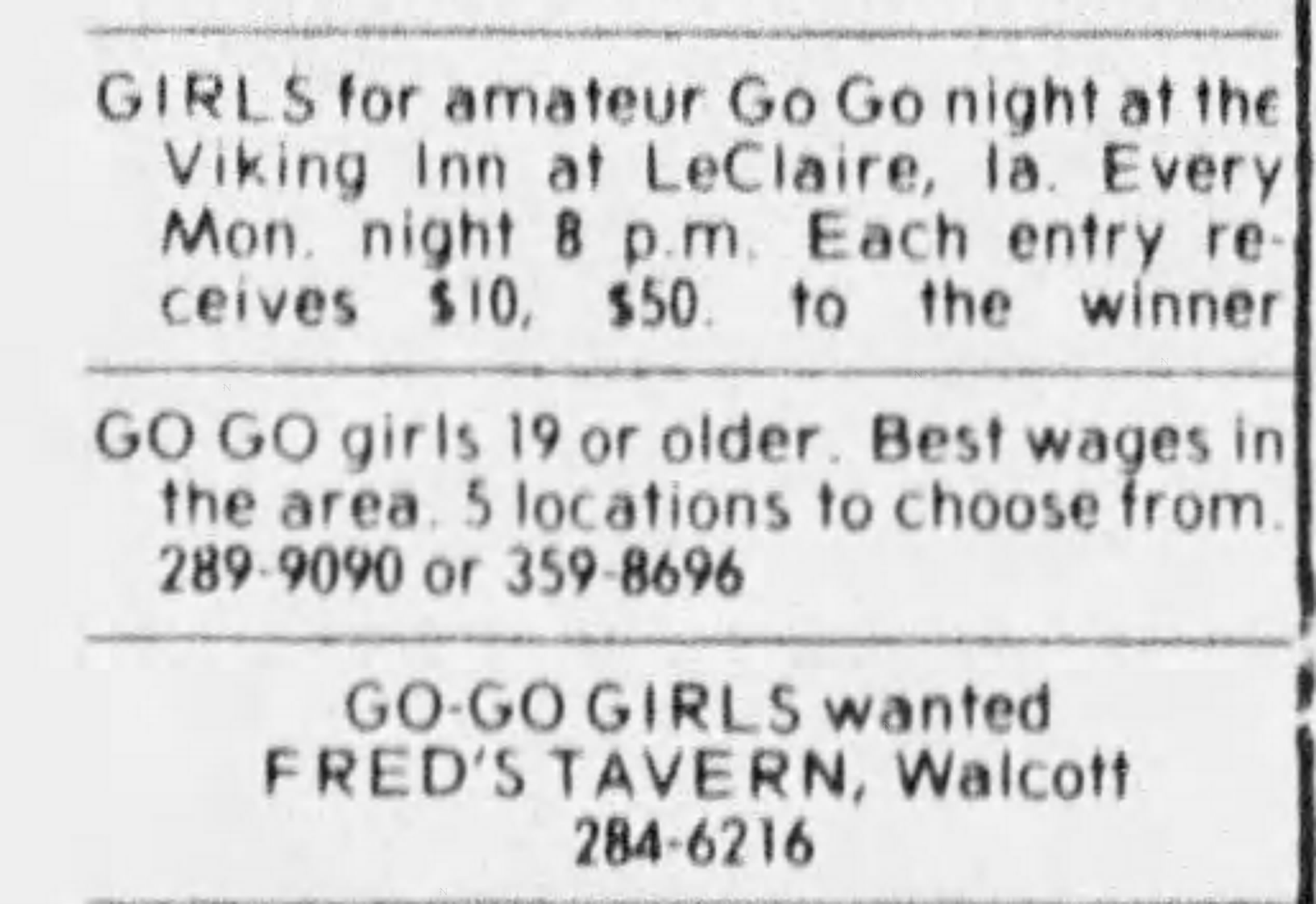 The go-go dancing craze swept through the Midwest in the late 1960s, a trend made unmistakable by the flood of want ads appearing in the Quad City Times between 1960 and 1979.