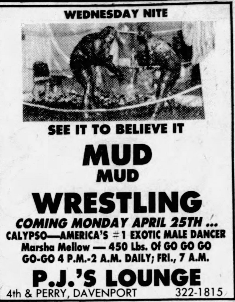 P.J.’s Lounge emerged in the late 1970s as one of Davenport’s more eclectic adult entertainment venues, leaning into spectacle as much as sensuality. In 1977, the bar advertised mud wrestling matches alongside appearances by a male exotic dancer known as “Calypso” and a plus‑sized go‑go performer billed as “Marsha Mellow.” This blend of novelty acts, gender-diverse performers, and body‑inclusive casting set P.J.’s apart from the more conventional go‑go bars of the era.