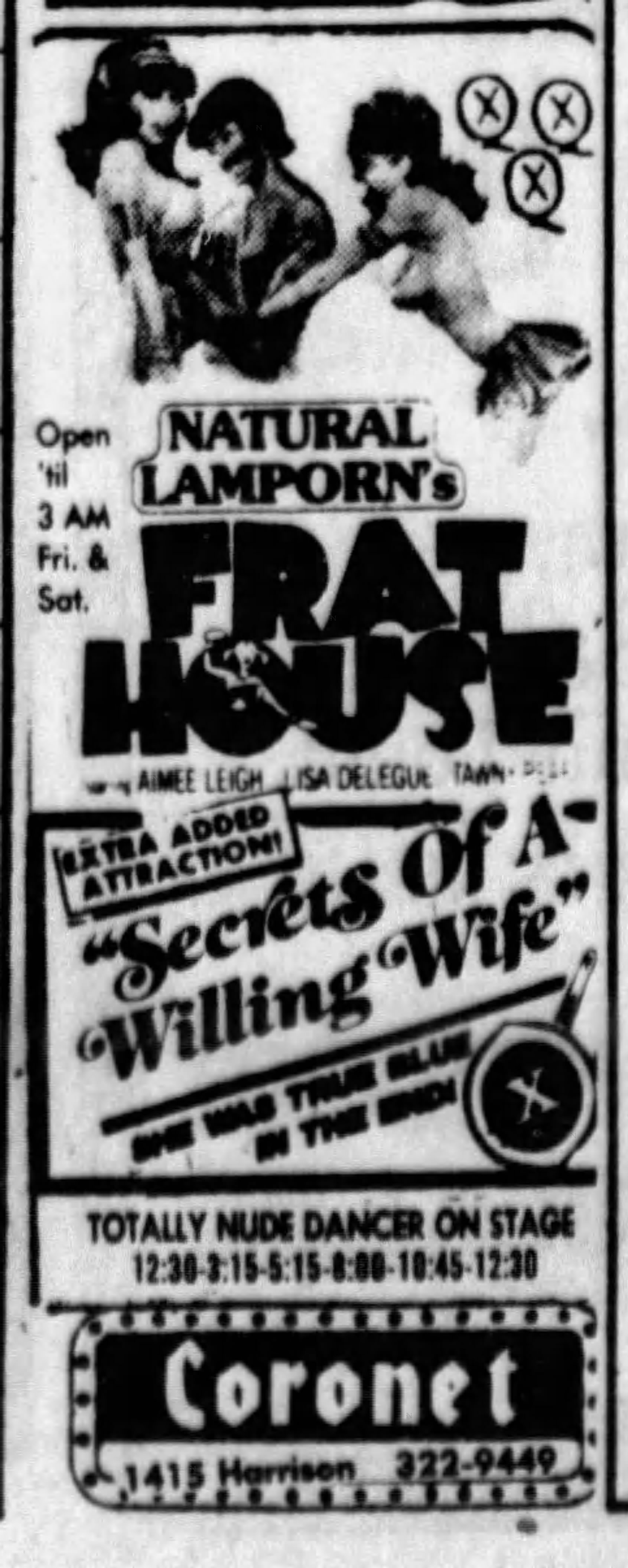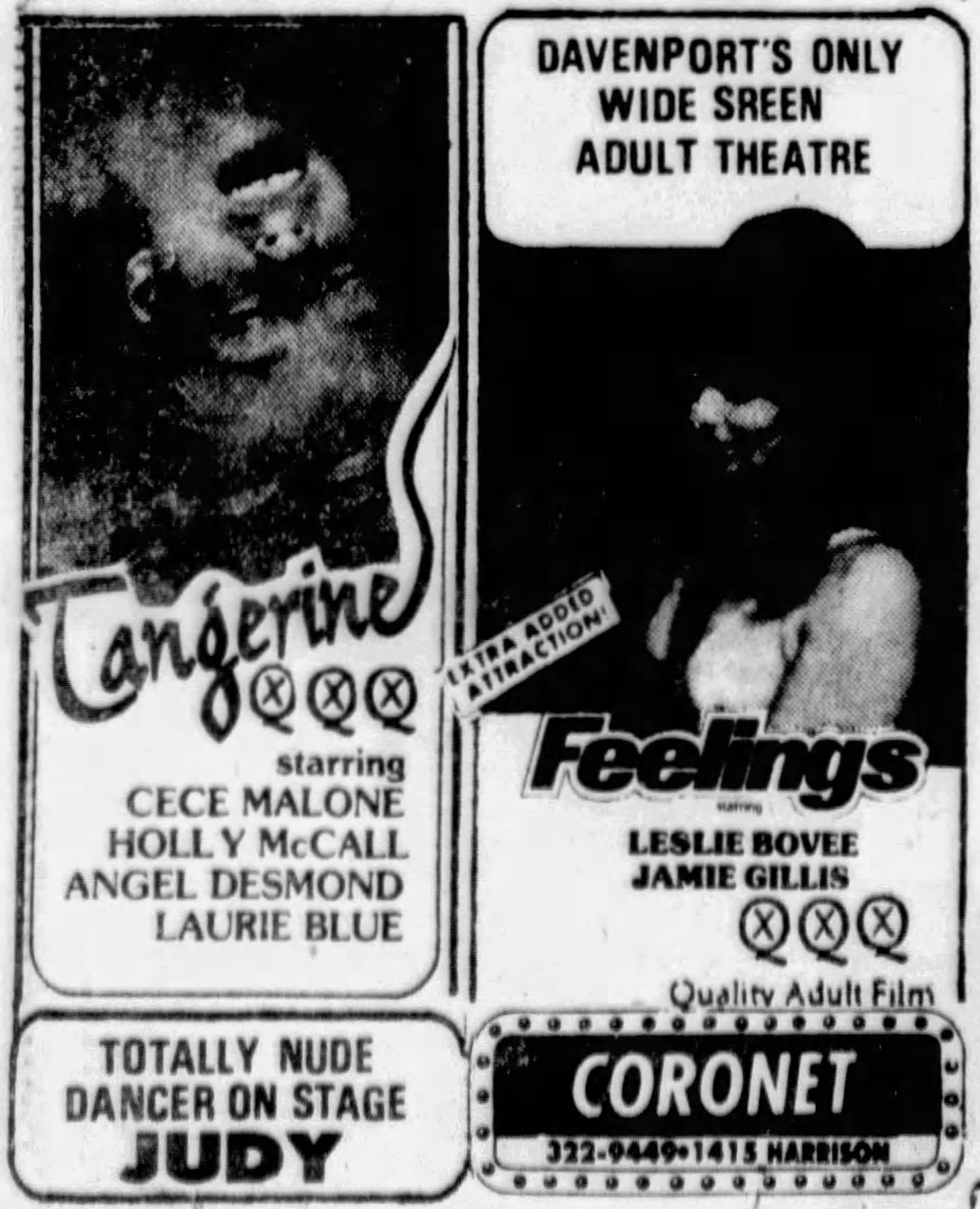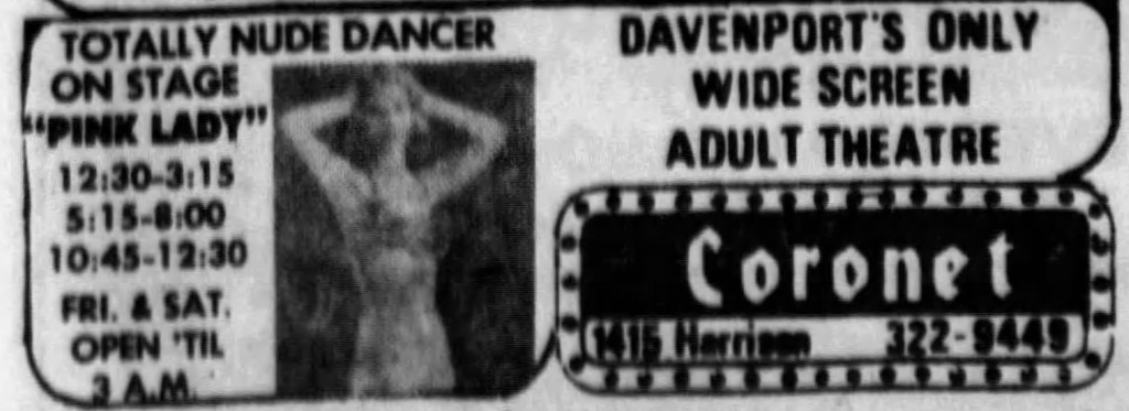 Most newspaper advertisements did not advertise the performer name, simply listing “Totally Nude Dancer on Stage” or simply “Nude Dancer – Mon.-Fri.” Other adult entertainment venues existed in Davenport. By 1984, the Cornet was shutdown closed after the “partnership that owned it had been dissolved.” However, there was a large push from Davenport ministers against pornography in the Quad Cities. A group of about 40 people gathered to support ministers after the cinema closed (even though there was no confirmation as to the citizens’ efforts being responsible for the theater closing.” (Quad City Times. “40 join porn fight.” Diana Penner. Page 1. June 29, 1984)
