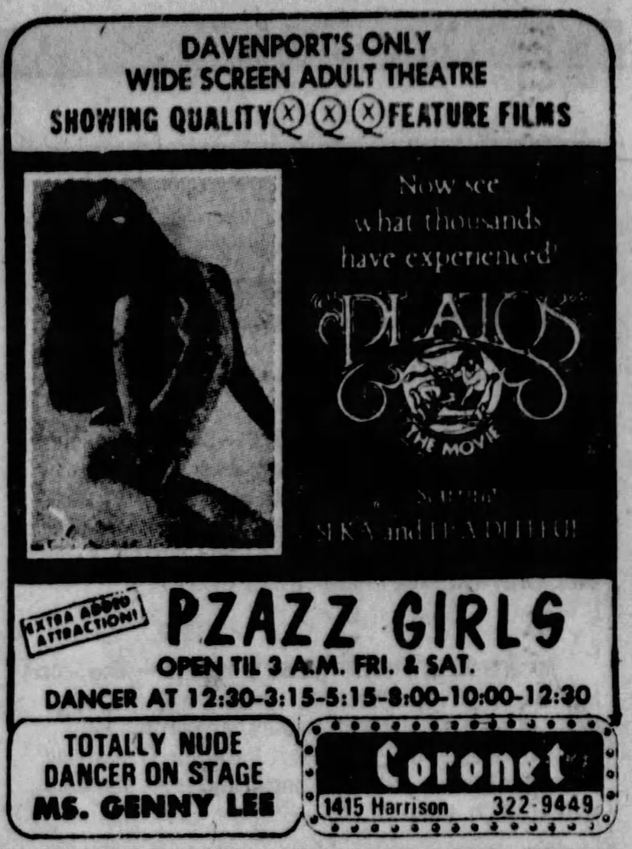 Advertisements from the Quad City Times highlight 1980 when the Cornet Adult Movie Theater opened. It featured XXX Films on the wide screen and live nude dancers on the stage. The Cornet advertised frequently in the Quad City Times. The Theater was open until 3:00am on Fridays and Saturdys. Nude dancers could be found on stage at 12:30pm, 3:15pm, 5:15pm, 8:00pm, 10:45pm, and 12:30am. (October 30, 1980)