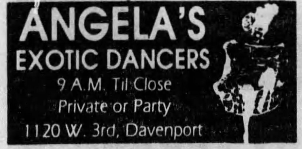 Beginning in 1988, Angela’s Exotic Dancers emerged as one of the Quad Cities’ more visible adult‑entertainment companies, offering private bookings for parties and events. Their ads promoted both male and female exotic dancers, as well as escorts, positioning the business as a mobile alternative to club‑based entertainment. Angela’s remained a steady presence in the classifieds through the early 1990s, disappearing from advertisements after 1992—suggesting the company likely closed or shifted operations as the region’s adult‑entertainment landscape continued to change.