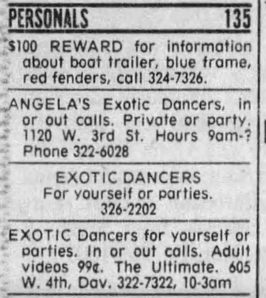 By the 1980s, the Quad Cities’ adult entertainment economy had grown beyond bars and lounges, and the Wanted ads reflected that shift. Alongside listings from clubs seeking topless dancers were advertisements for independent companies offering exotic entertainment on demand. Businesses like Angela’s Exotic Dancers and The Ultimate marketed themselves as full‑service providers, supplying dancers for private parties, personal bookings, and special events. Their presence in the classifieds signals a diversification of the industry: erotic labor was no longer confined to fixed venues but was increasingly mobile, customizable, and entrepreneurial.