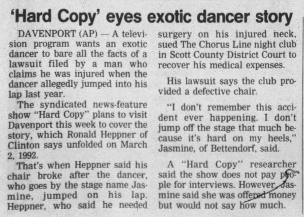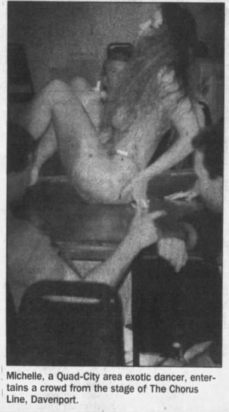 An exotic dancer, Jasmine, of Bettendorf, jumped onto the lap of a patron named Ronald Heppner, breaking the chair beneath him. Ronald needed surgery to his neck, and he ended up suing the Chorus Line night club in court for his medical expenses. Jasmine stated, “I don’t remember this accident ever happening. I don’t jump off the stage that much because it’s hard on my heels.” (The Gazette. January 13, 1993)