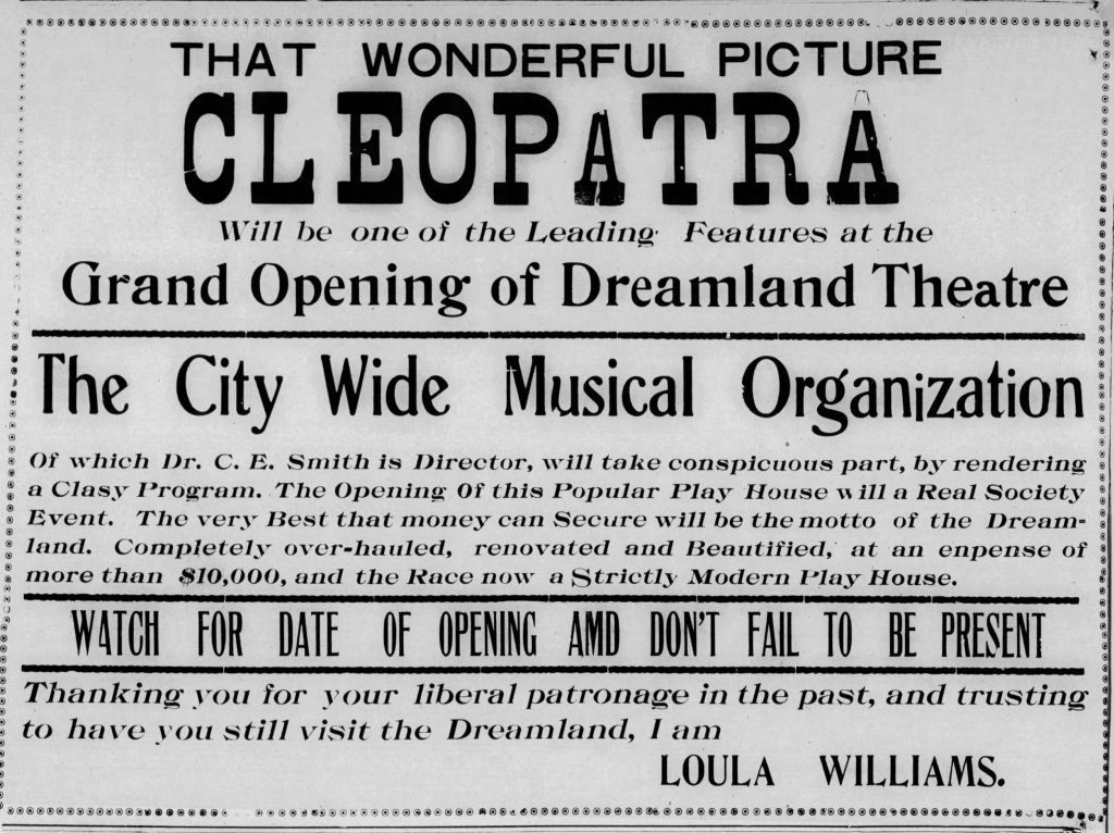 A 1915 article states the Dreamland Theatre was giving away “prizes” to the audience in the form of groceries and other “provisions.” A mass meeting was held the same year to organize leaders and laymen “of the Race” for “mutual protection.”