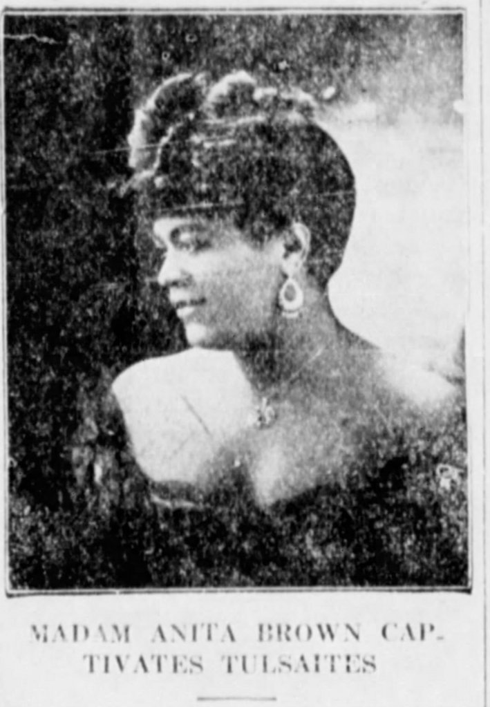 - The Tulsa Star. “Madam Anita Brown Captivates Tulsaites; The Queen of Song, Lives up to Her Great Name as a Singer.” Page 1. February 1, 1919