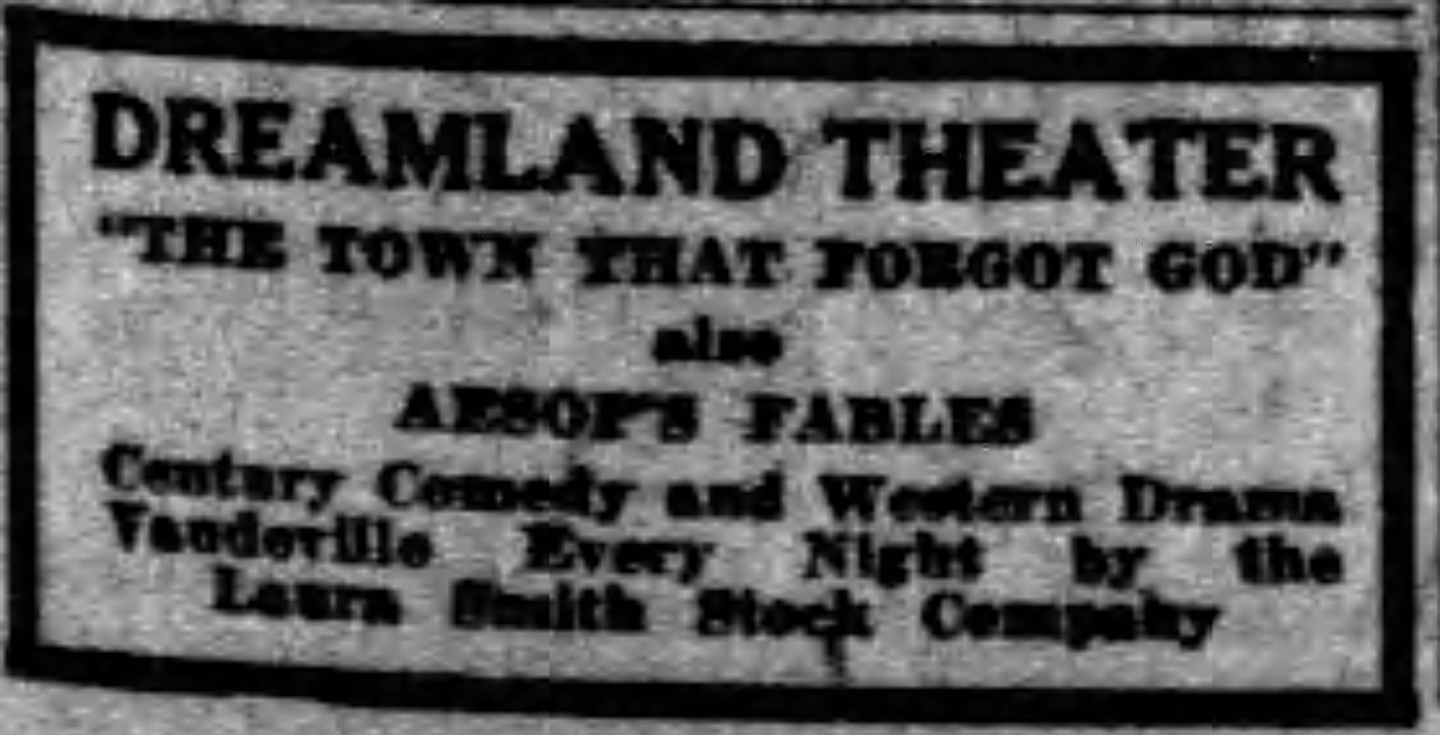 - “The Town that Forgot God” and Aesop’s Fables and Laura Smith Stock Company every night (September 1923)